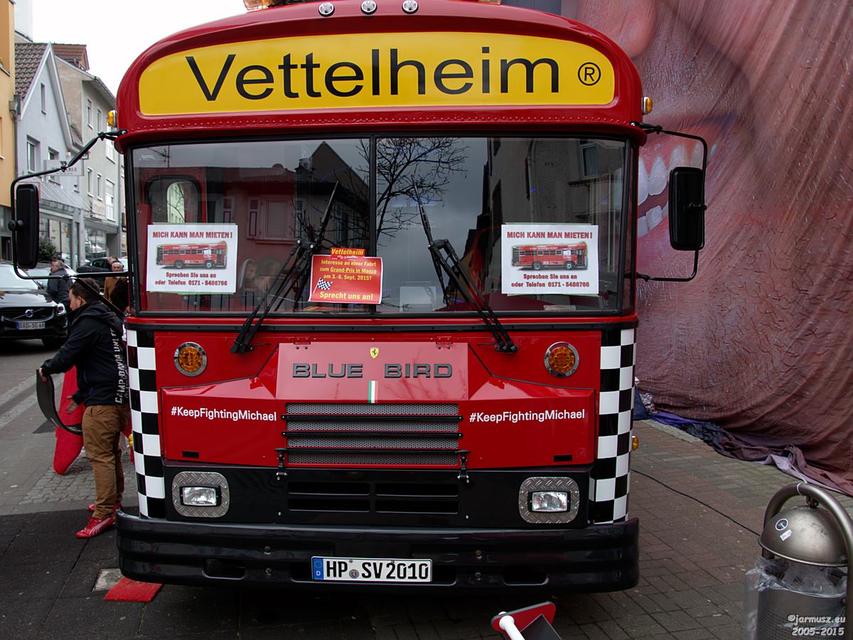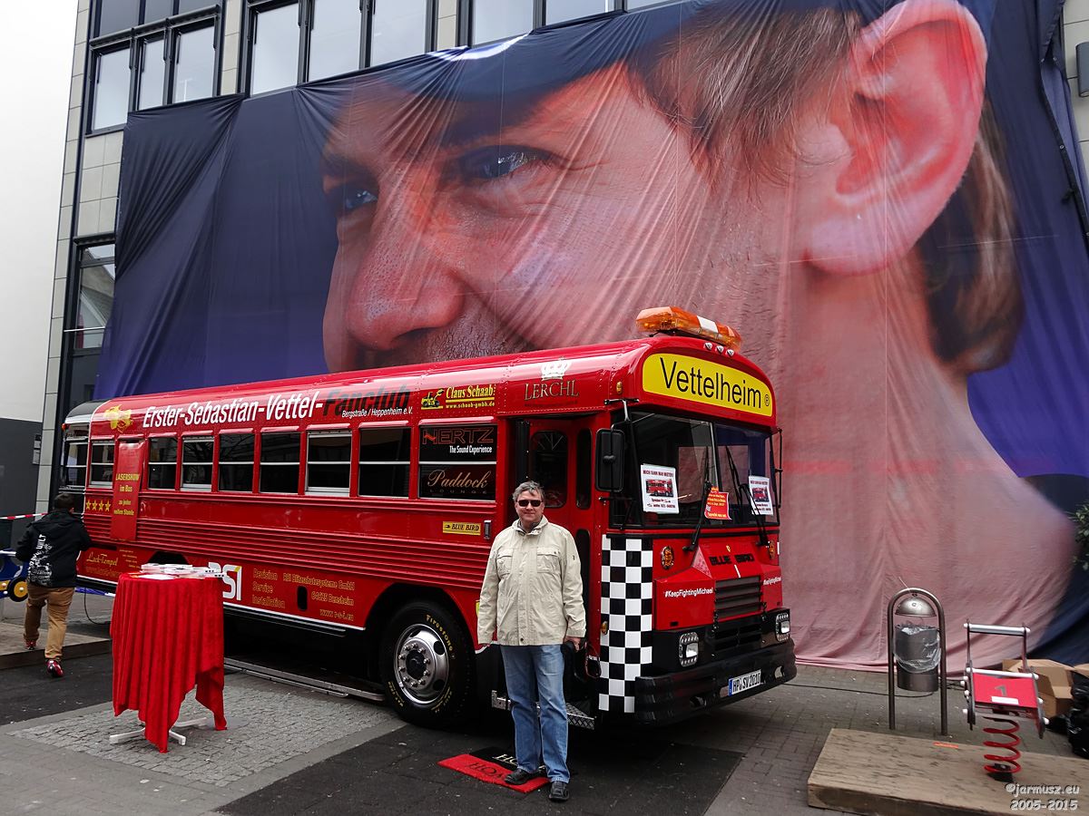 Ein alter amerikanischer Schulbus wurde im Lacktempel der Firma Goss (Audi, VW) – dem Sitz des Fanclubs von seinem alten Red Bull-Blau in aktuell Ferrari Rot umlackiert. Denn jetzt ist in Heppenheim Rot angesagt.