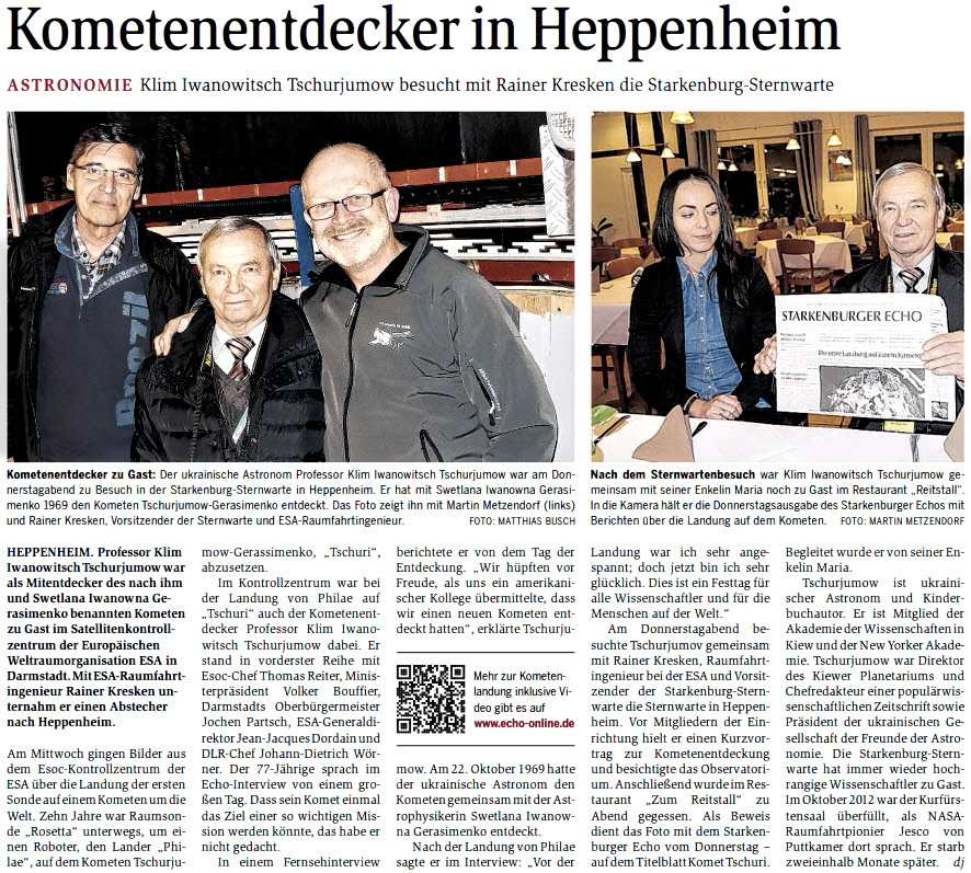 Am Donnerstag, den 13.11.14 – gerade am Tag der Landung auf dem Kometen – war einer der Entdecker, Klim Tschurjumow mit seiner Enkelin in Heppenheim. Sie waren in Darmstadt in der Europäischen Weltraumorganisation ESA und haben dabei einen Abstecher zu Starkenburg-Sternwarte in HP gemacht.