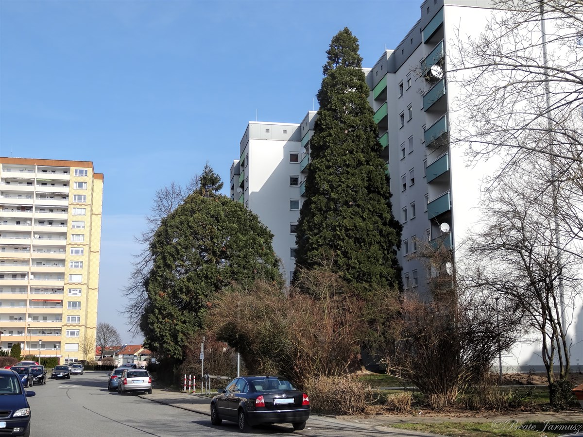 3. Frankfurter Str 57. Hier wachsen zwei Bäume. Der große überragt schon 10. Etage des Hochhauses und ist gleichmäßig gewachsen und rund.