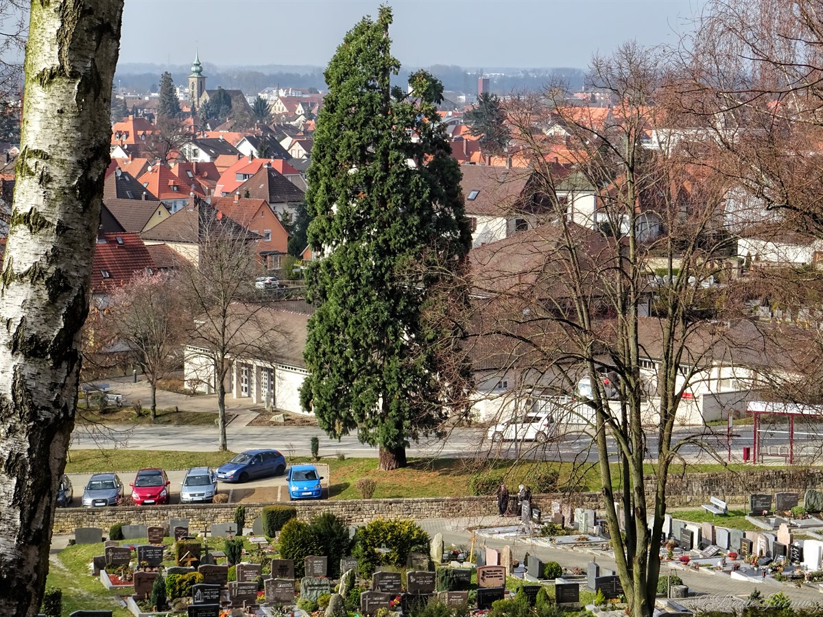 1. Neuer Friedhof, Stadtausfahrt Richtung Erbach. Der Baum ist von der Nordseite beschädigt. Sein Alter wird im Zusammenhang mit dem Bau der “Anstalt” im 1866 geschätzt, also ca 150 Jahre.