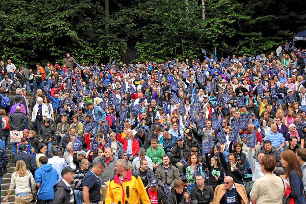 Kurz nach 10 Uhr haben wir schon den Eingang passiert und gleich einen blauen Sebastian-Finger bekommen, für später zum winken. Wir waren bei weitem nicht die ersten!! Die besten Sitzplätze waren schon besetzt, aber wir haben noch schöne gefunden.