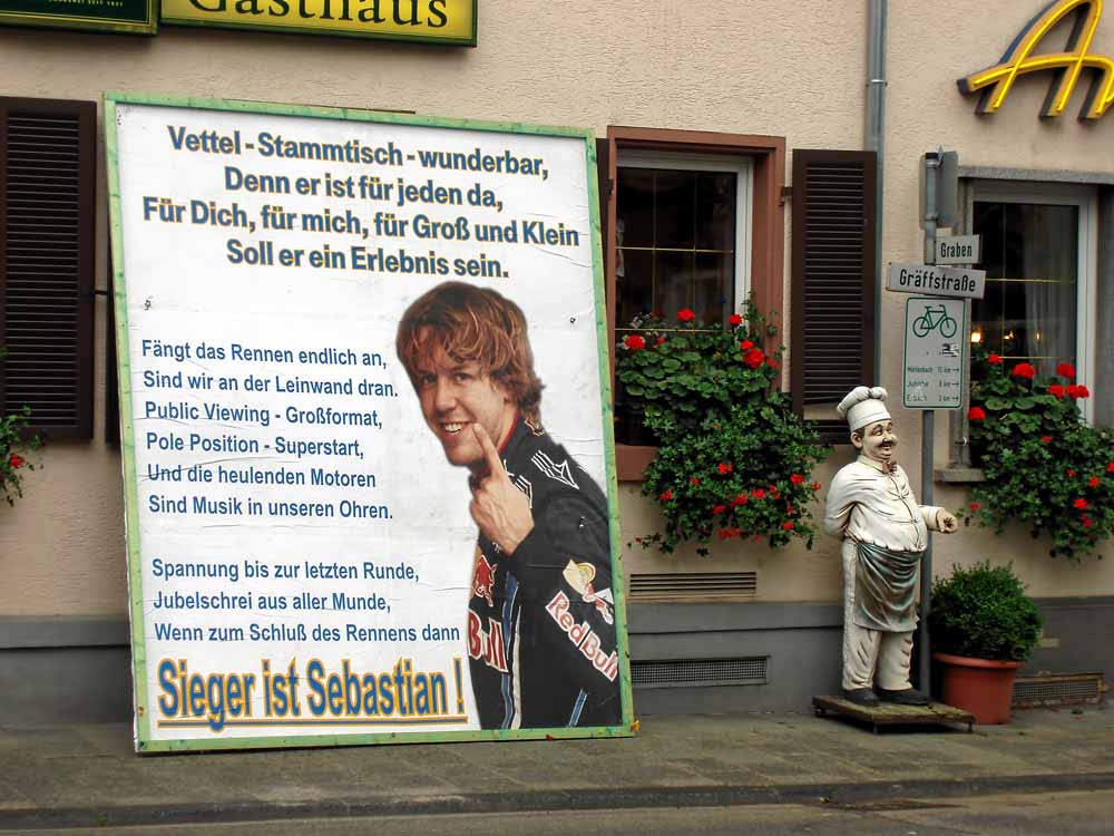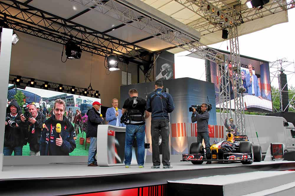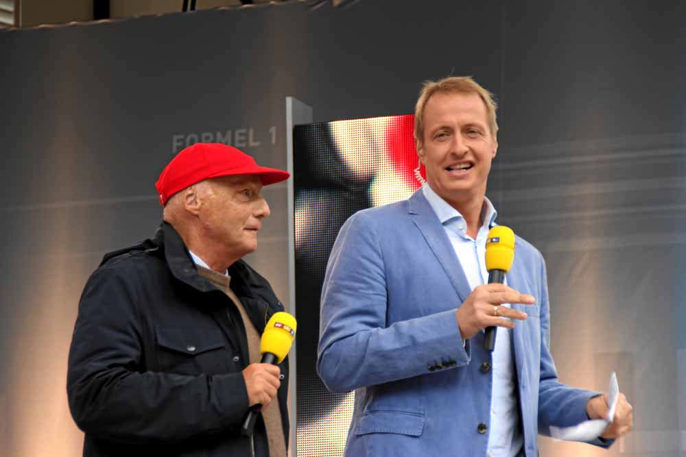 Dann war schon Niki Lauda und Florian König da, haben Vorgespräche und Ansagen geführt. Aber als sie später mit dem Sebastian-Vettel-Fan-Club-Bus wieder auf die Bühne gebracht wurden – so für TV – dann haben wir, wie besprochen, so getan, als wenn wir sie zum ersten mal gesehen hätten.