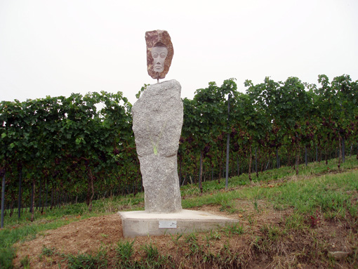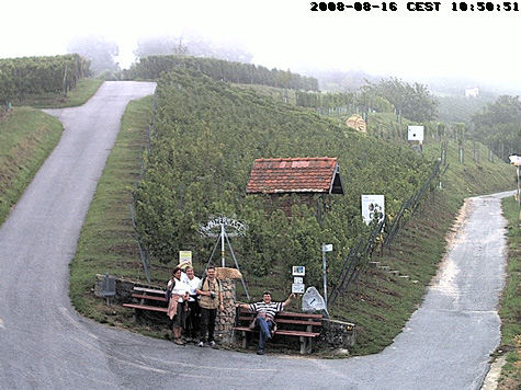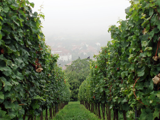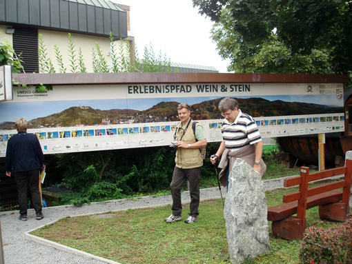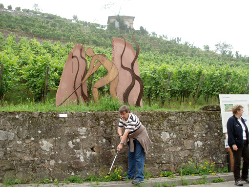 Neugierig nach den Informationen aus dem Prospekt und Internet, haben wir uns am Samstag, mit Freunden, Karte, Rucksäcken und viel Humor auf den Weg gemacht. Der Tag war noch neblig, aber die Wettervorhersage vielversprechend. Wir waren die ersten unterwegs, Stille, leichter Nebel umhüllte die Stadt unter uns, ein Reh lief über den Weg. Auf dem ersten Kilometer sind wir nicht gut vorwärts gekommen, da wir immer wieder etwas gefunden und gesehen haben, das wir lesen, schauen, fotografieren wollten. Schon vor 11:00 haben wir uns schauspielerisch vor der Webcam präsentiert und freundlich gewunken- wer weiß, wer uns da im Internet sieht. Wir haben viele Skulpturen gesehen, die hiesige Artisten aus Materialien aus der Gegend gezaubert und in die Weinlandschaft platziert haben. Dann sind wir in ökologischen Garten abgebogen, und nicht gemerkt, dass uns auf diese Weise ein Teil entgeht: mit weiteren Skulpturen und der mediterranen Bepflanzung (u.a. Palmen, neu seit Frühjahr). Abhilfe nötig: an der Stelle stimmt etwas nicht mit der Beschilderung. Fazit? Wir müssen noch mal hin.